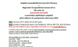 Pozvánka – Diskusní setkání o prioritách politických subjektů před volbami do poslanecké sněmovny 2025 – 25.9.2025 – Brno OHKadmin 25.8.2025 25.8.2025Aktivity komory, Aktuálně, Pozvánky 2025, brno, volby Setkání politických lídrů Jihomoravského kraje na hospodářské komoře. Více informací